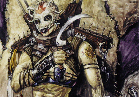 Mike Nielsen came up with a cool gang for Shadowrun called the Helloweeners. This is the first Helloweener I did. I love the restrictive, gallows-like harness on this scary chick. The handcuffs through the board is inspired by a device that serial killer John Wayne Gacy used. Very scary stuff. |